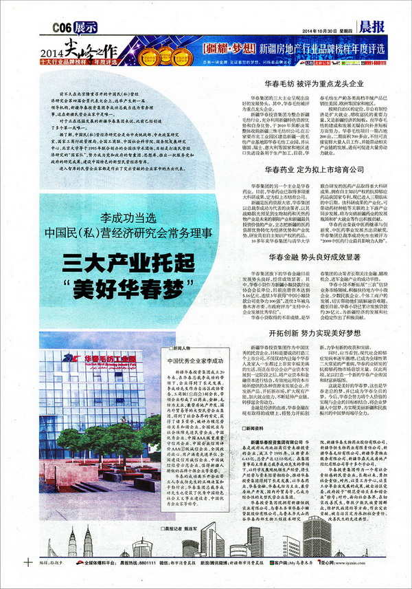 10月30日的《晨報》于C06版用整版篇幅,以“李成功當選中國民(私)營經濟研究會常務理事,三大產業(yè)托起美好華春夢”為題,對華春大業(yè)進行了專題報道。