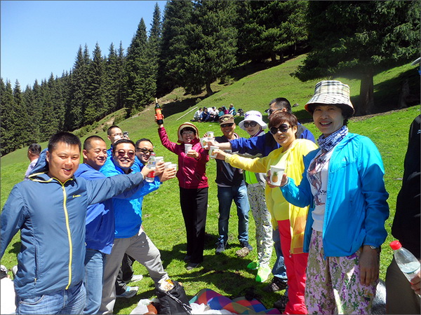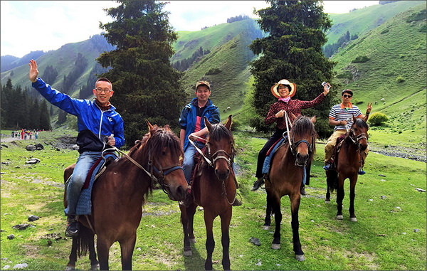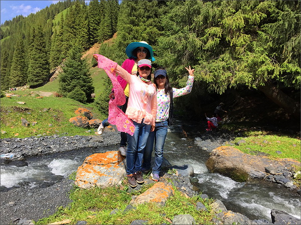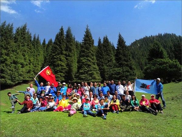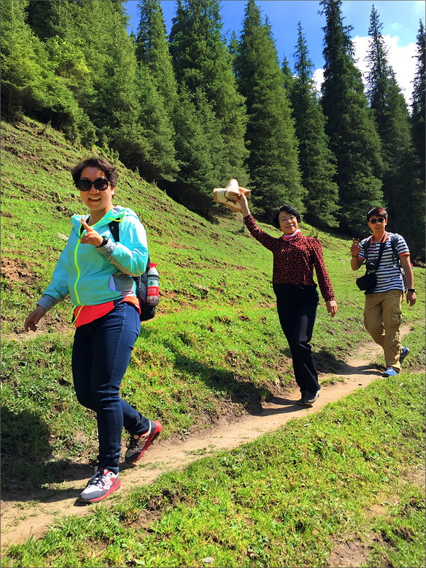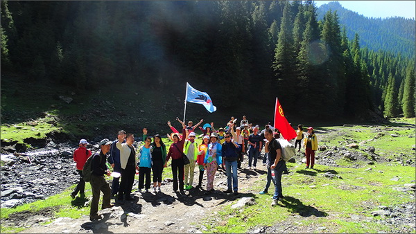 從喧囂的都市來到南山群山中風景優美的溝谷之一沙溝,這個位于北天山支脈北麓的山區,集中的展現著大美新疆的妙景。深邃的峽谷,蒼翠欲滴,在重峰疊嶂、唯有山羊才能攀巖上去的危崖聳立之處,一條蜿蜒的山道出其不意在期待著我們的步伐,眼前豁然開闊。在如茵的草坡,山花吐艷。白色的氈房點綴著一派綠色美景,不由得想起一句歌詞:氈房好似珍珠撒。盡管當今已難免的染上了一抹市場經濟的色彩,但當哈薩克牧民的羊群從我們徒步隊伍中穿過時,立馬提醒著后人,這個俊美的山區從唐代就曾是著名的牧區狩獵區,霎時有一種在時空中穿梭的感覺。