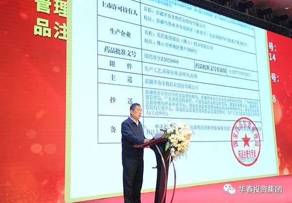 新疆自治區(qū)藥監(jiān)局黨組成員、副局長(zhǎng)余永強(qiáng)宣讀了國(guó)家藥品監(jiān)督管理局于2022年12月29日批準(zhǔn)的新疆華春生物藥業(yè)抗抑郁癥1.1類中藥創(chuàng)新藥“參葛補(bǔ)腎膠囊”上市許可證書和“參葛補(bǔ)腎膠囊”的優(yōu)勢(shì)特點(diǎn)。