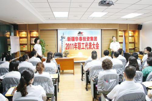 新疆華春投資集團有限公司職工代表大會于2011年6月11日上午在華春集團恒潤公司培訓室召開。51位參會的職工代表,肩負著集團與各子公司的430多名員工的重托,對“三項集體合同”即集體合同、工資集體協商合同和女職工權益保護專項集體合同草案進行了審議,經大會討論和民主表決,“三項集體合同”草案獲得通過,并形成職工代表大會決議書。