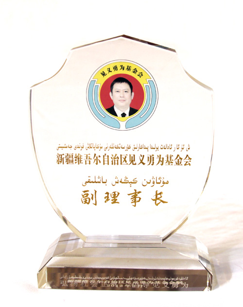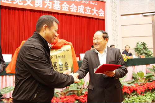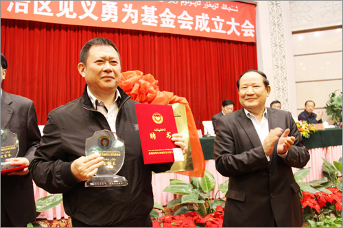 自治區見義勇為基金會成立大會于2012年10月19日上午在自治區人民大會堂多功能廳隆重舉行,新疆華春投資集團董事局主席兼總裁李成功先生當選自治區見義勇為基金會首屆理事會副理事長,自治區副主席、黨委政法委副書記賈帕爾•阿比布拉為李總裁頒發了副理事長證書和座牌。