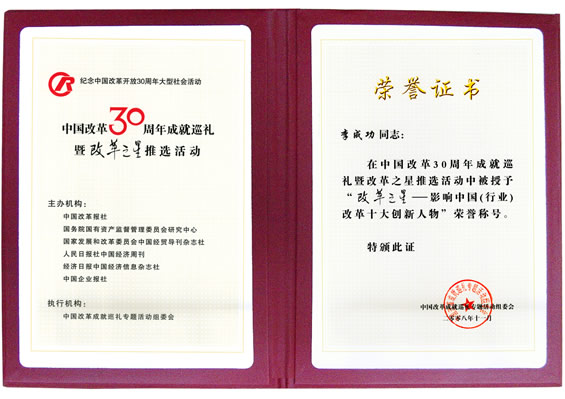 “改革之星--影響中國(行業)改革十大創新人物”榮譽稱號