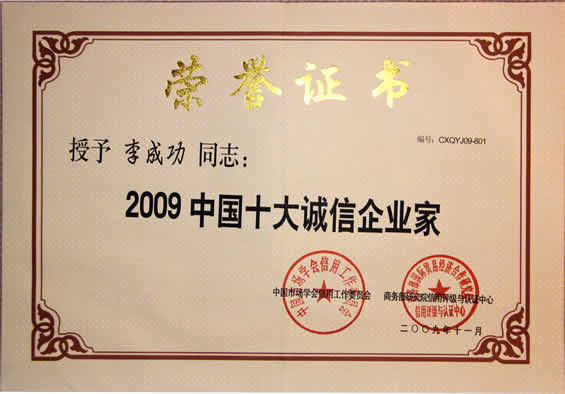 “2009中國十大誠信企業(yè)家”榮譽證書