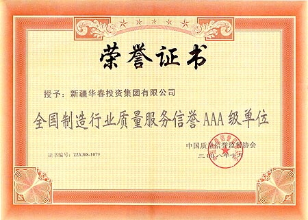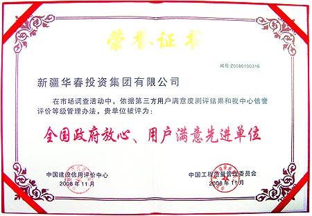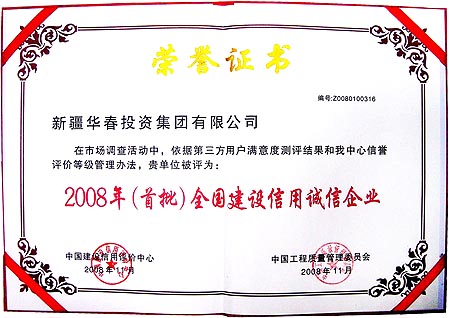 在不平凡的2008年即將逝去之時,新疆華春投資集團(tuán)以其實際,贏得了相應(yīng)的眾多榮譽:10月被中國質(zhì)量信譽監(jiān)督協(xié)會評為全國制造行業(yè)質(zhì)量服務(wù)信譽AAA級單位;11月被中國建設(shè)信用評價中心、中國工程質(zhì)量管理委員評為 “2008年(首批)全國建設(shè)信用誠信企業(yè)”和“全國政府放心、用戶滿意先進(jìn)單位”,頒發(fā)了獎牌和證書(證書編號:Z0080100316)。